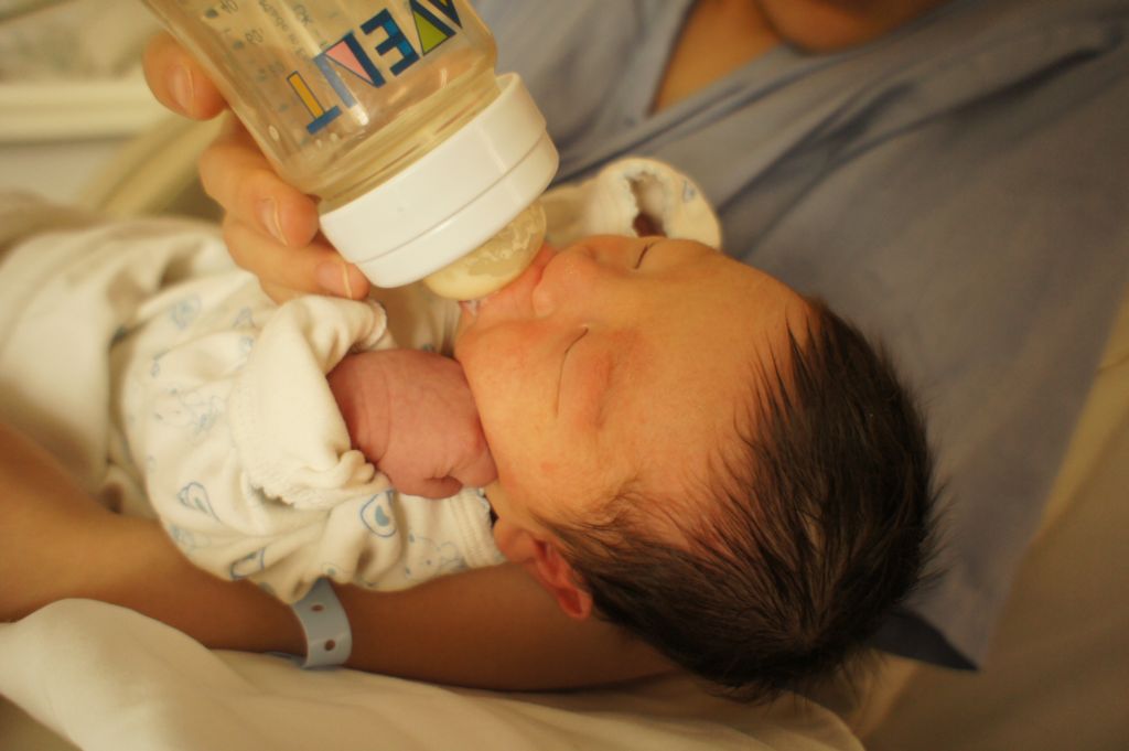 凛太郎におもちゃにされて疲れた貫太郎は、初めてのミルク20ccをグビグビと一気呑み。
