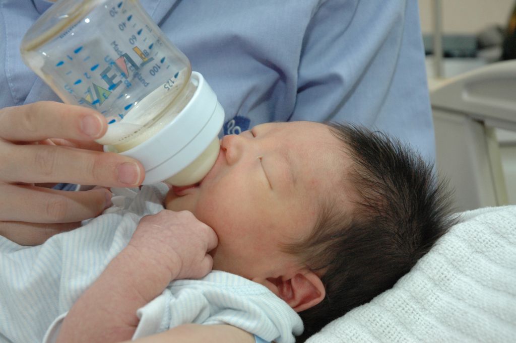 凛太郎におもちゃにされて疲れた貫太郎は、初めてのミルク20ccをグビグビと一気呑み。
